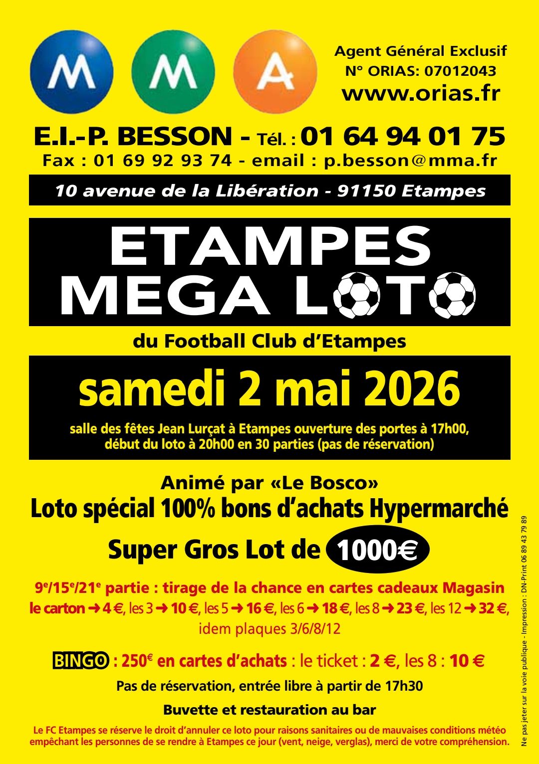 Le Football Club d’Étampes (FCE) vous donne rendez-vous le samedi 2 mai à la salle des fêtes Jean-Lurçat pour un mega loto animé par « Le Bosco ».