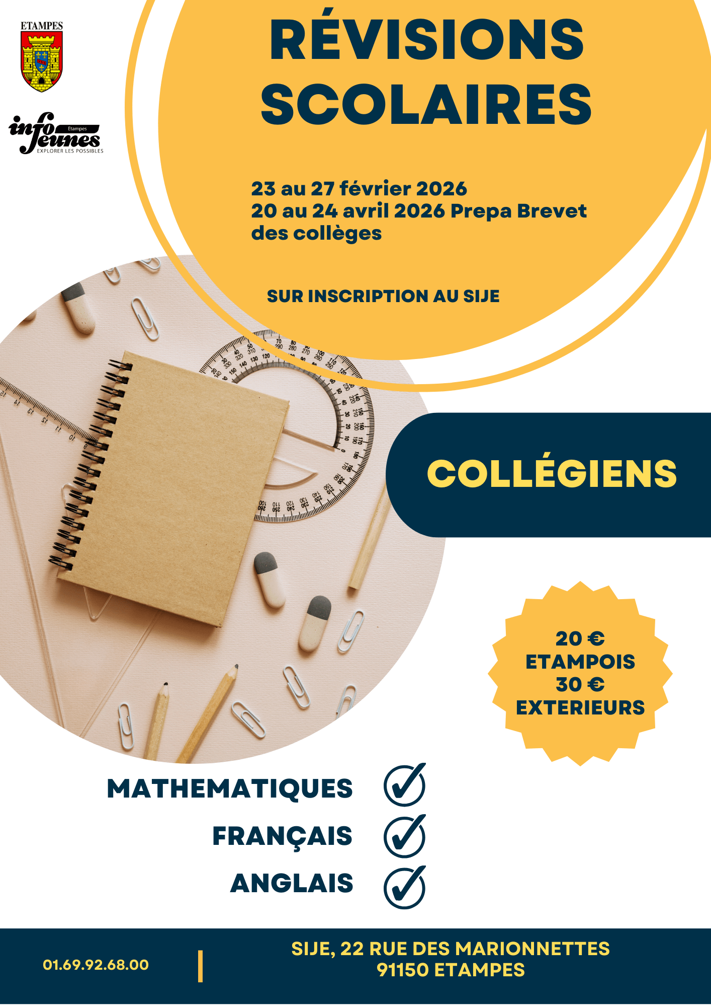 Renseignements et inscriptions : 01 69 92 68 00 / sije@mairie-etampes.fr ou directement au SIJE (22, rue des Marionnettes)