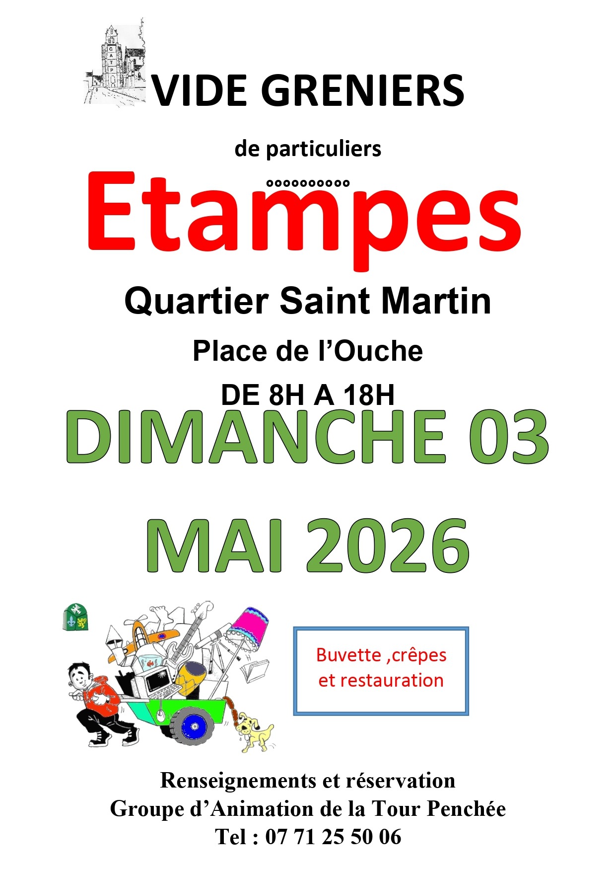 Chaque année, le Groupe d’Animation de la Tour Penchée (GATP), créé en 1994 par Jean Fartel et une bande de copains, vous invite à son vide-greniers.