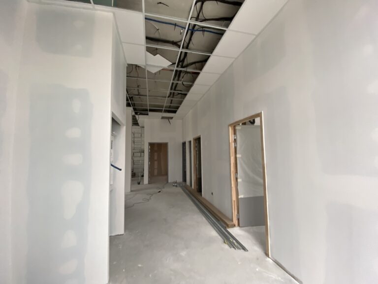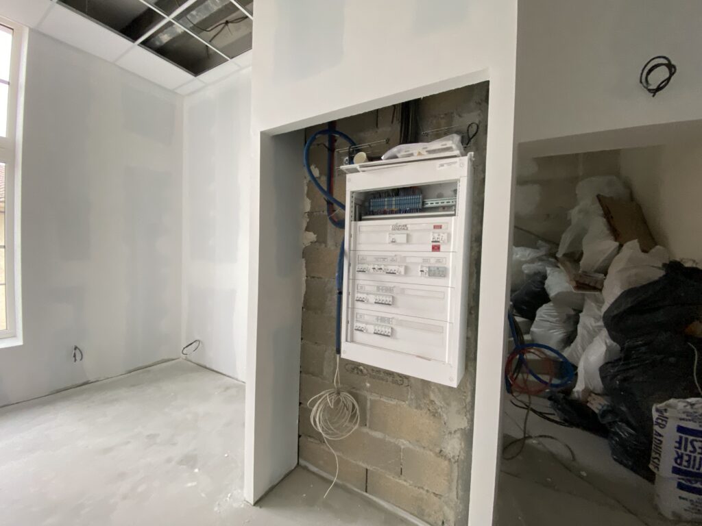 La chape du sol a notamment été coulée et les volumes des différentes pièces commencent à se dessiner avec la pose des cloisons, des portes et des faux plafonds. L’installation électrique a également été réalisée, avec la mise en place d’un important tableau électrique de répartition destiné à alimenter et sécuriser l’ensemble des futurs équipements.